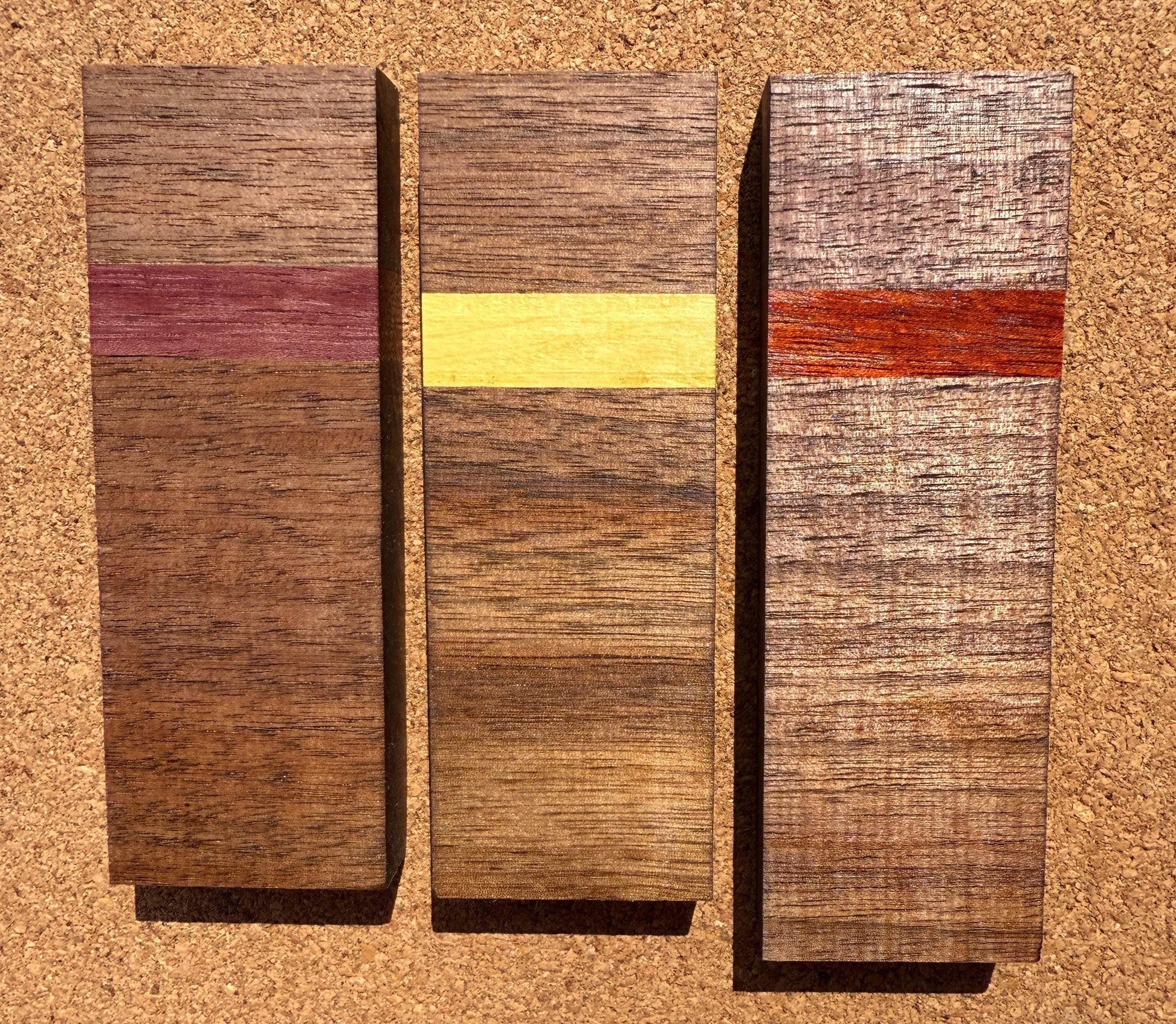Material: Solid walnut hardwood and one of the following: purple heart, yellow heart, or bloodwood (Displayed in that order in sample photo)